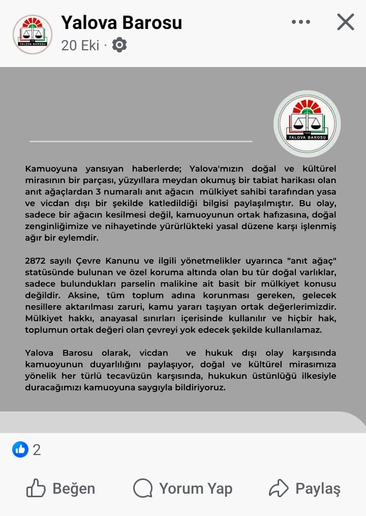 Yalova Barosu, ev hayvanlarının korunması konusunda defalarca çağrı yaptı. Ama kesilen ağaçlarla ilgili neden aynı duyarlılığı göstermedi diye merak ettim ve bugün bizzat Baro’ya gidip sordum.